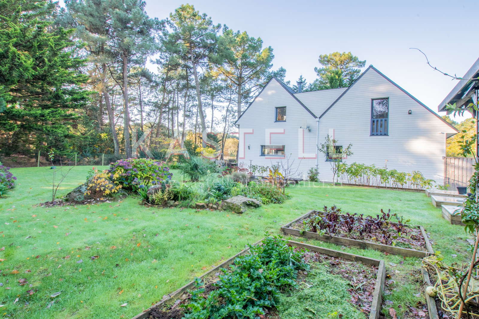 Dans un environnement verdoyant à 5 km des plages et à 3 km du bourg de CARNAC, au calme de l'agitation estivale, à vendre maison contemporaine en ossature bois avec 5 chambres.