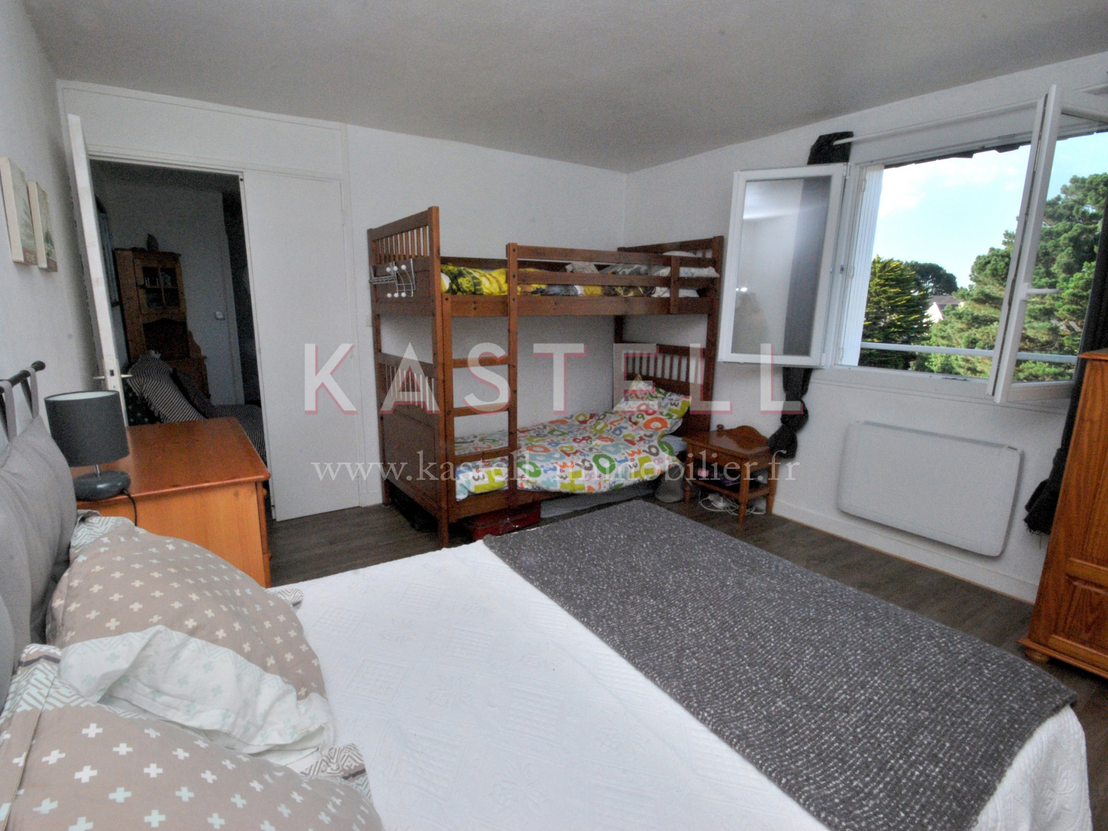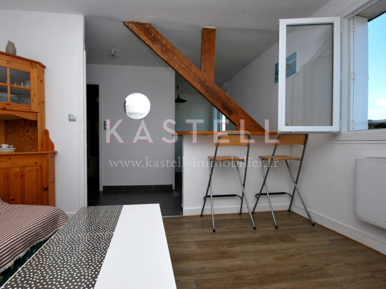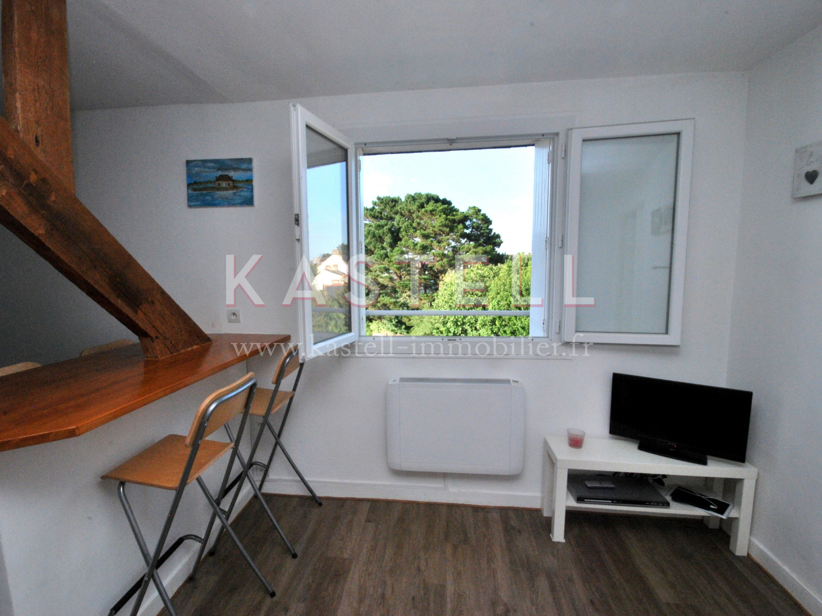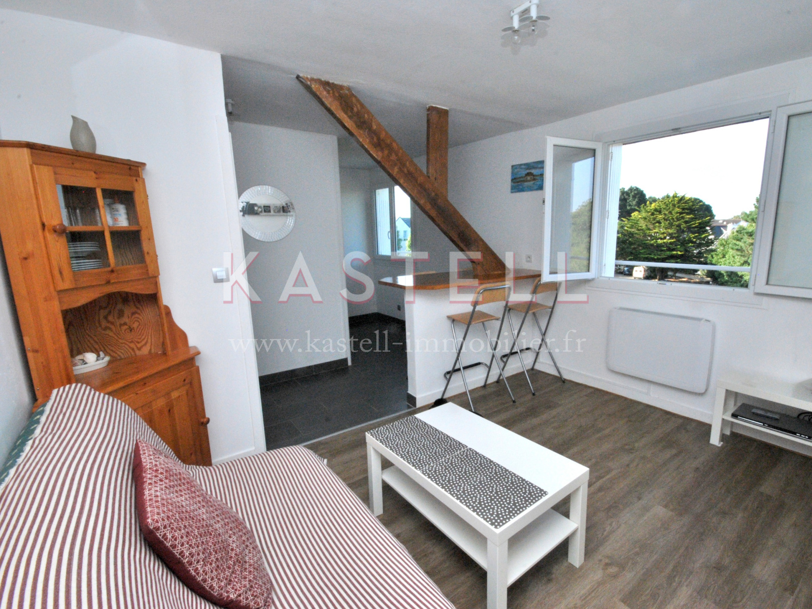 A vendre appartement de type 2 de 34m2 au troisième et dernier étage sans ascenceur d'une résidence du bourg de carnac, à 250 m de l'église. L'appartement clair et rénové, avec une vue dégagée, dispose d'un salon de 10m2, une cuisine équipée de 4m2 et d'une grande chambre de 13m2. Une pièce attenante à la cuisine vous donnera un espace de rangement supplémentaire. Une place de parking privatif et un local à vélo commun sont également à votre disposition. Les plages se trouvent à 5 minutes à vélo.