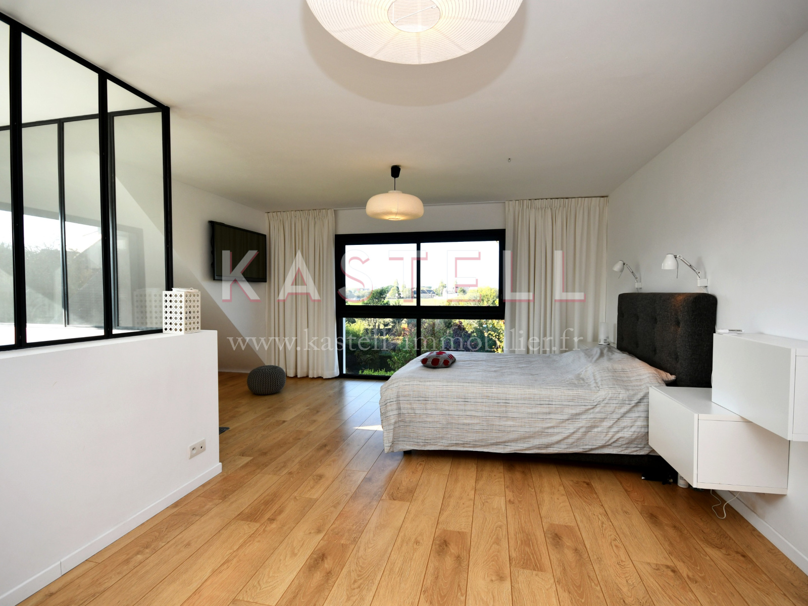 Maison d'architecte d'environ 340m2 habitables spacieuse et lumineuse, située au calme d'une impasse à mi-chemin entre la plage et la ria d'étel. Cette construction récente de 2011 s'étend sur un jardin paysager de plus de 3500 m2.
