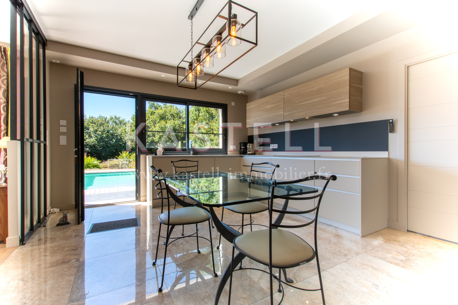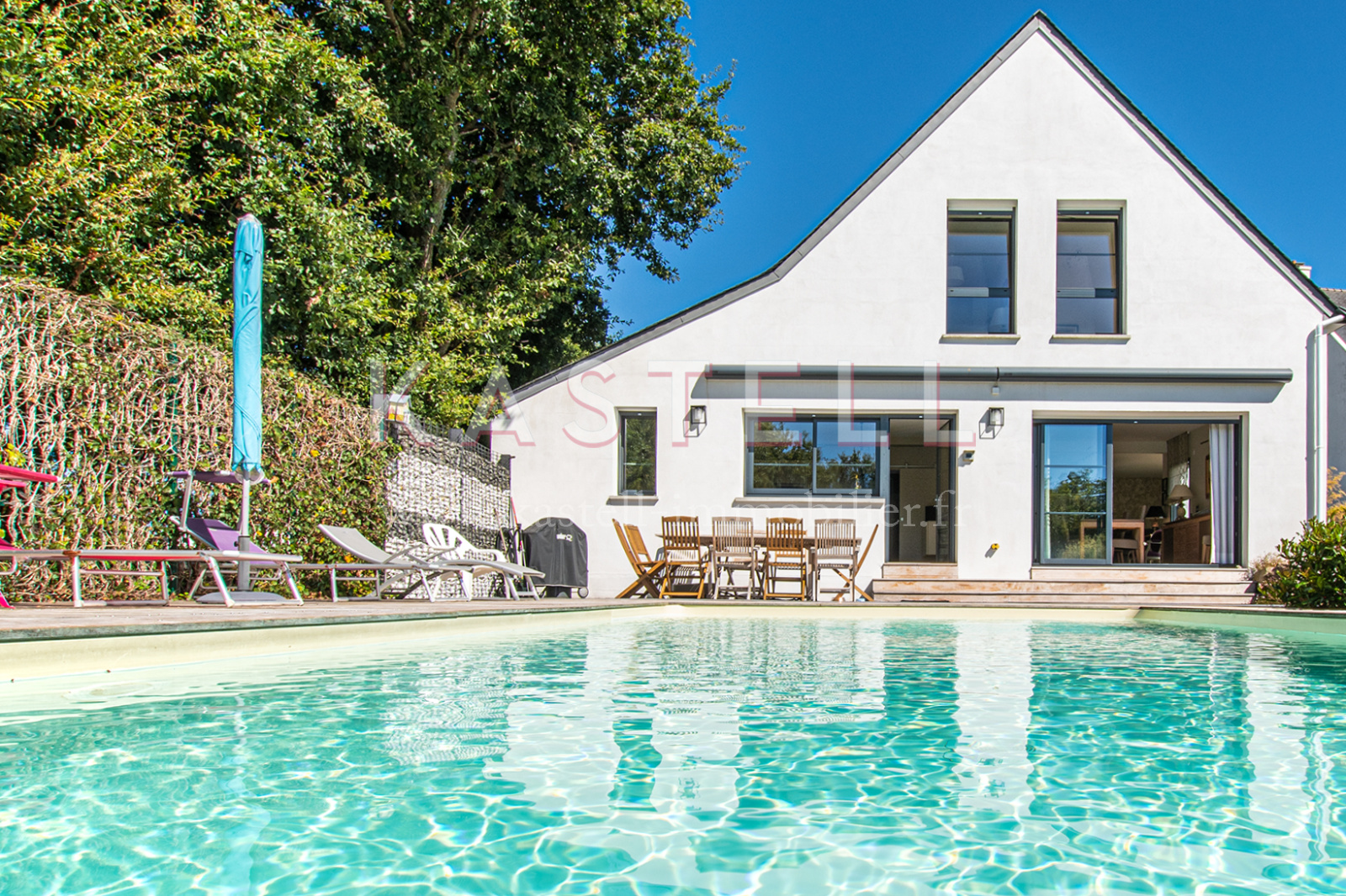 A vendre chez Kastell Immobilier, maison contemporaine aux prestations haut de gamme avec piscine chauffée, construite en 2015 sur un terrain de plus de 1300 m2 en bordure du Golfe du Morbihan, sur la commune de LOCMARIAQUER.