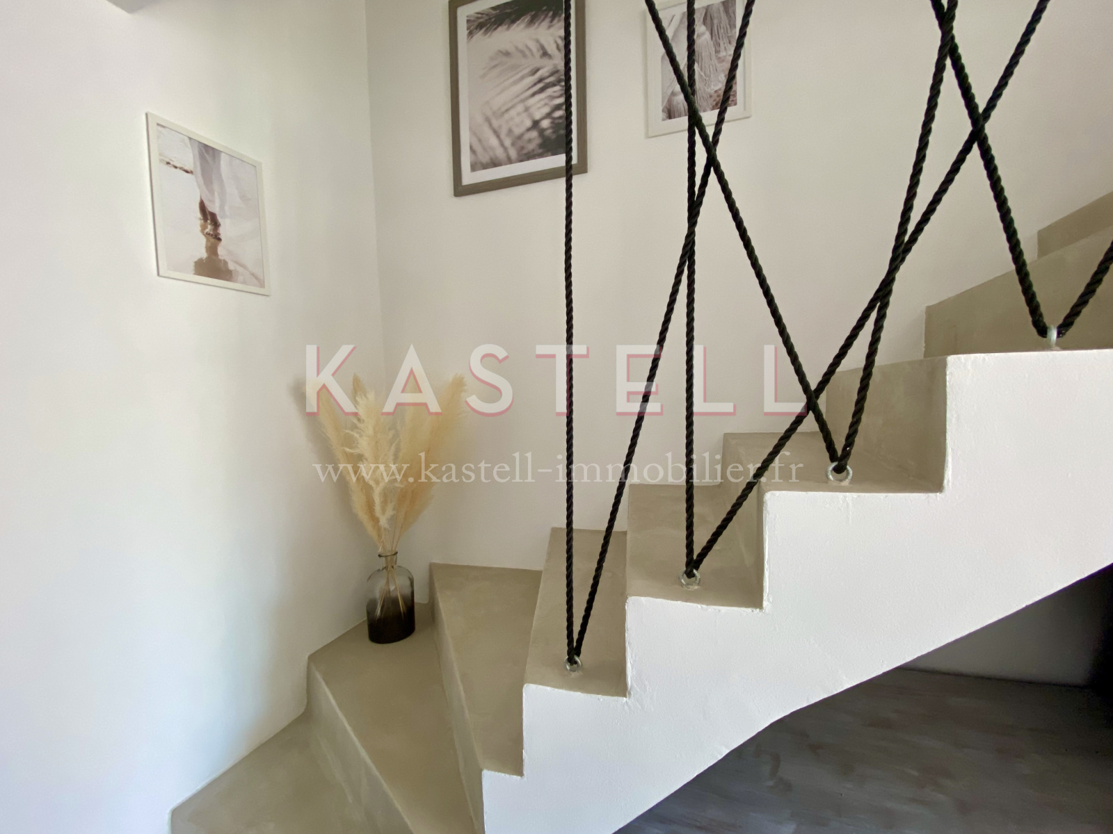 L'escalier en béton ciré dessert deux chambres, un dégagement avec mezzanine (14m2 env.), une salle de bain. Un balcon filant sur l'une des deux chambres ainsi que la mezzanine.